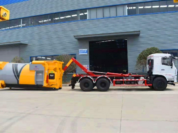 勾臂垃圾車【車廂可卸式垃圾車】車體和垃圾箱可完全分離,由液壓系統(tǒng)來完成收箱/放箱,在平日里可將車載垃圾箱放置到各個垃圾收集點(diǎn),待垃圾收集滿后,該車可直接開赴收集點(diǎn),通過液壓系統(tǒng)的操控,可將垃圾車后座上加裝的勾臂放下,掛住站內(nèi)箱體前端的連接點(diǎn),將垃圾箱拉**車體的后座上,此時即可開動車輛,將垃圾運(yùn)送垃圾處理站內(nèi),進(jìn)行自卸式傾倒,優(yōu)點(diǎn)就是可一車配多斗,一輛車就可以維持?jǐn)?shù)個垃圾收集站的運(yùn)轉(zhuǎn),效率高,且箱體為密封式設(shè)計,不會造成二次污染。