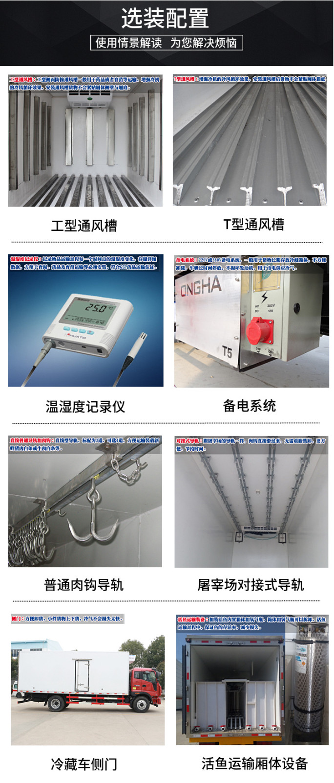 四、選裝配置:導(dǎo)軌肉鉤、T型通風(fēng)槽、右側(cè)開側(cè)門、溫度實時監(jiān)控帶打印裝置、裝海鮮廂體內(nèi)部面料必須選裝不銹鋼制造、可選裝12V-24V外接電源(車輛在停止時,廂體通過外接電源進行制冷)。