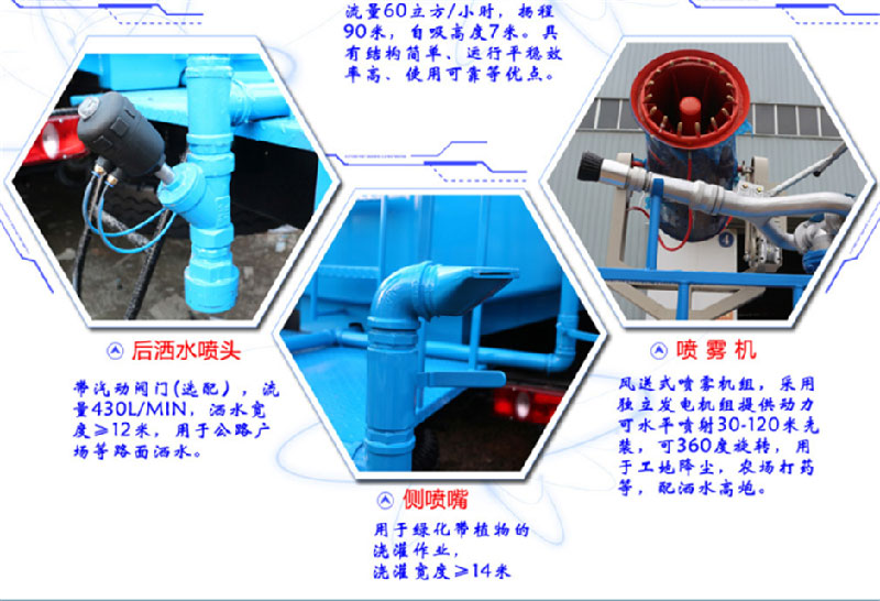 上裝配置:罐體采用國標(biāo)Q235碳鋼板材制作,產(chǎn)品質(zhì)量成熟可靠,設(shè)計(jì)**合理,比同類灑水泵吸程遠(yuǎn)、壓力大、使用壽命長,可泵進(jìn)泵出。前沖、后灑、側(cè)噴、高位花灑、帶后工作平臺(tái)及綠化灑水高炮(可全方位旋轉(zhuǎn),可連續(xù)調(diào)成直沖狀、大雨、小雨、毛毛雨等),抑塵霧炮(可降塵、噴霧、消毒、打農(nóng)藥等),水位計(jì),消防栓接口、快速接口、兩根輸水管,其余標(biāo)配。